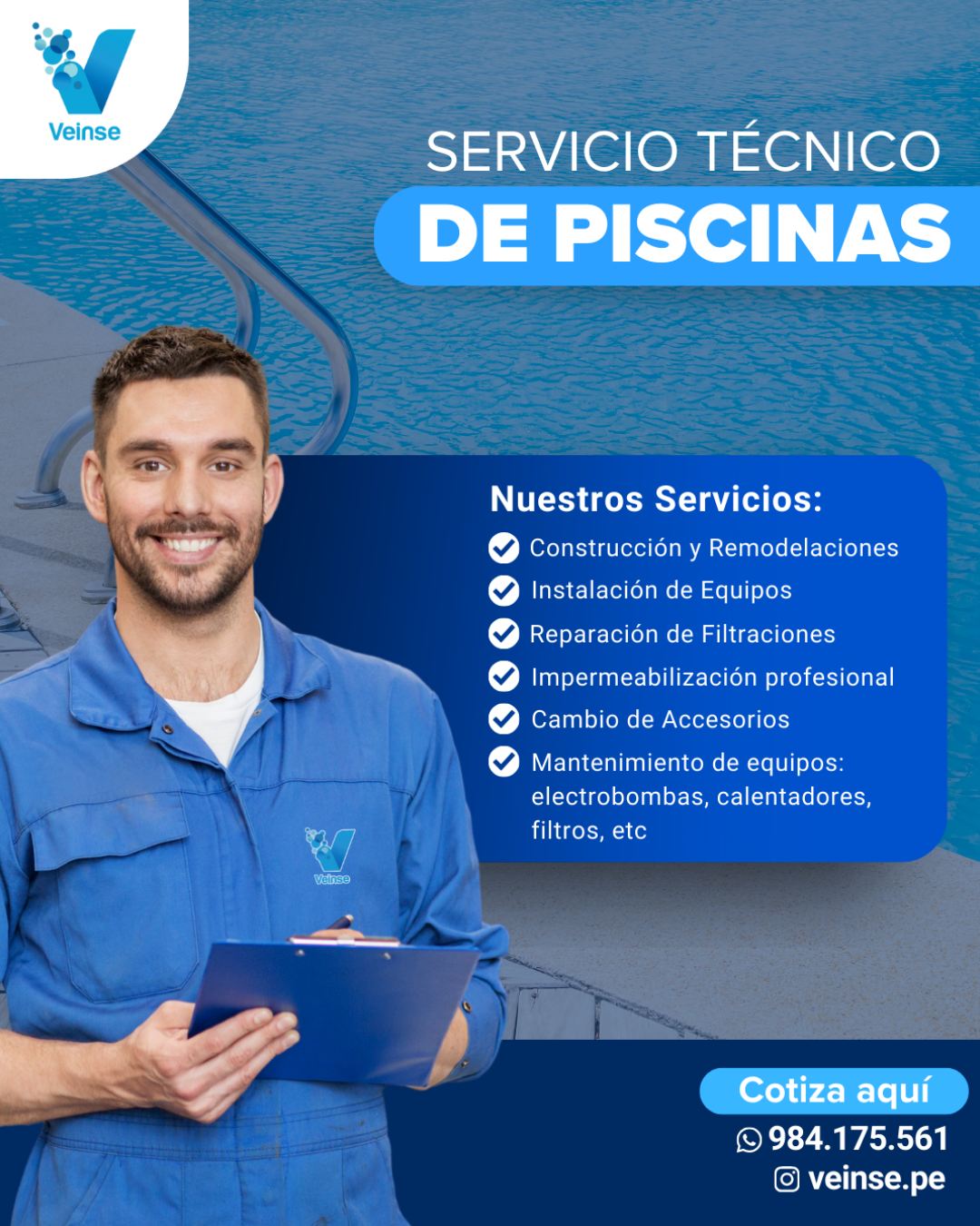 En Veinse ofrecemos un servicio técnico integral para piscinas, enfocado en garantizar el correcto funcionamiento, la seguridad y la durabilidad de cada sistema. Contamos con personal técnico especializado y experiencia en construcción, instalación, mantenimiento y reparación de piscinas residenciales y comerciales.
